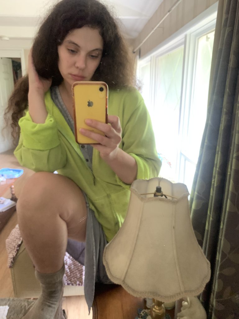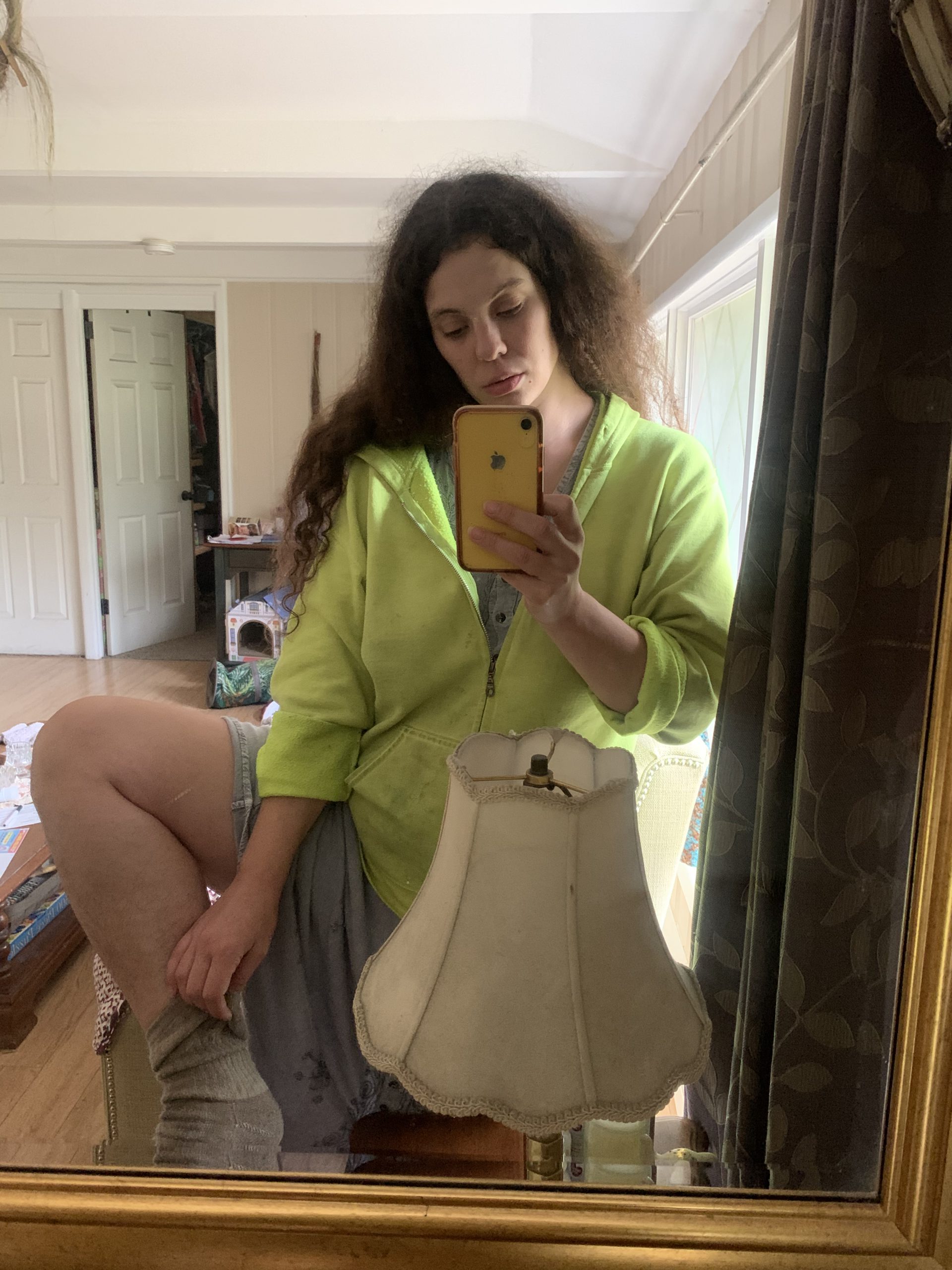 I was folding some laundry and decided to take a few mirror pics. I love my faded hoodie but at some angles the color just don’t look right. I am very warm and comfortable on this rainy day – for shoes I wore wigwam socks with sandals.